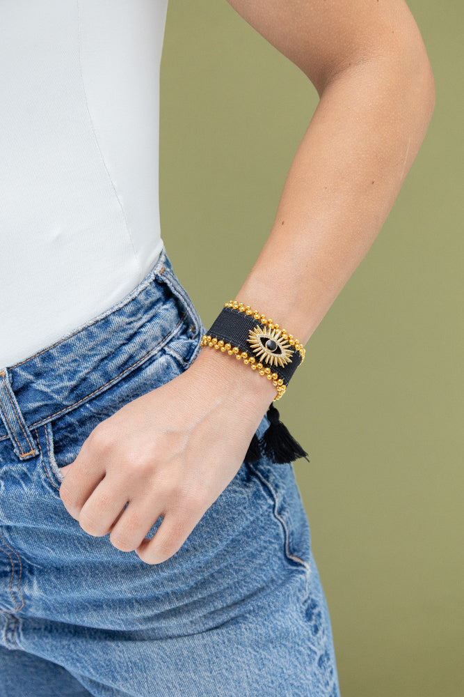 - Pulsera en tela con balines, nudo corredizo y borlas.