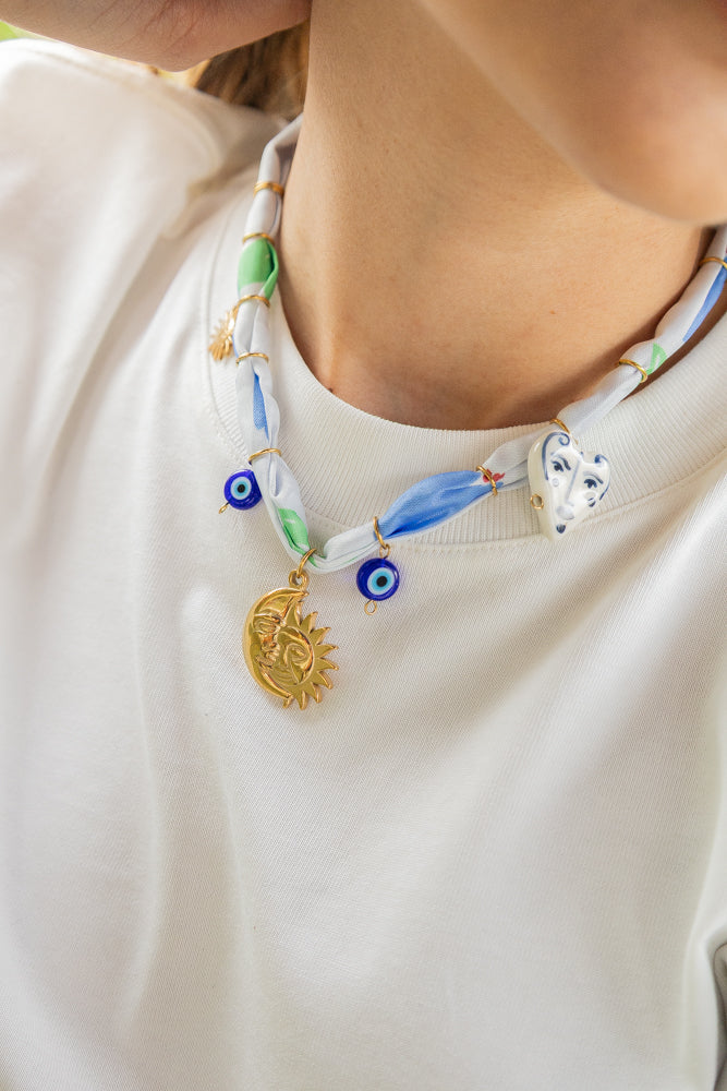 - Collar de pañuelo con dijes y acabados en acero con baño en oro de 24k.