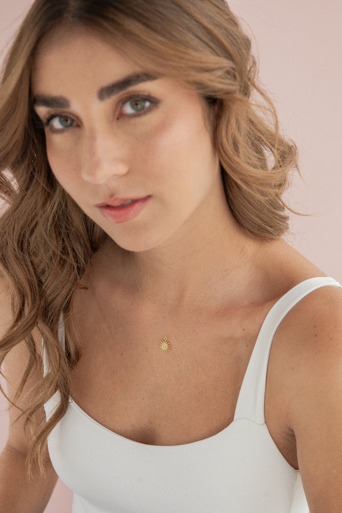 - Cadena invisible elaborada en Nylon, dije de sol en oro Goldfilled.