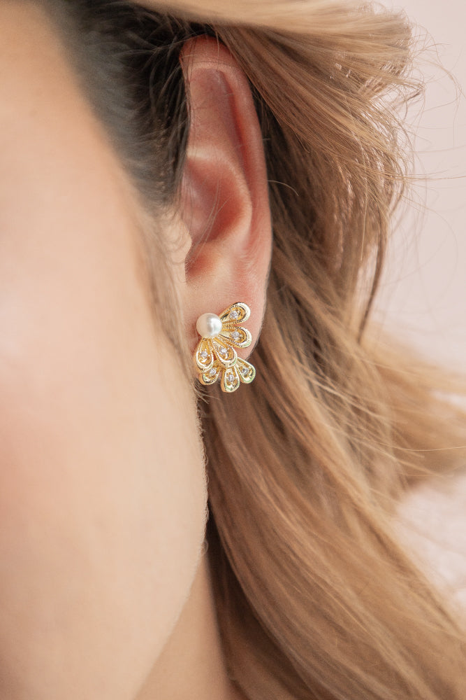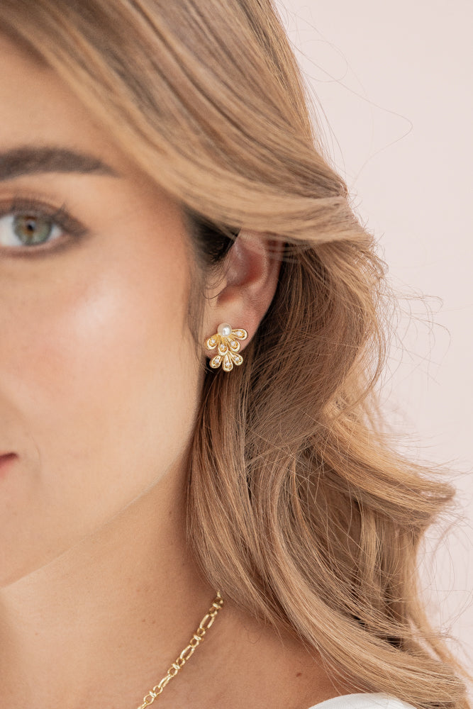 - Aretes elaborados en Acero con baño de oro de 24k con perla y circones.